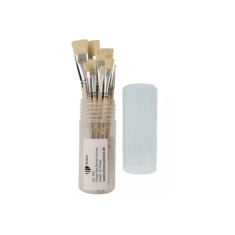 Zestaw pędzli niemieckiej firmy Lineo w plastikowej, skręcanej tubie. Przeznaczone do farb olejnych i akrylowych. W skład zestawu wchodzi 10 pędzli płaskich(s.518) z bielonej szczeciny, cynowym okuciem i krótkimi, nielakierowanymi trzonkami w rozmiarach 2, 4, 6, 8, 10, 12, 14, 16, 18 i 20.
