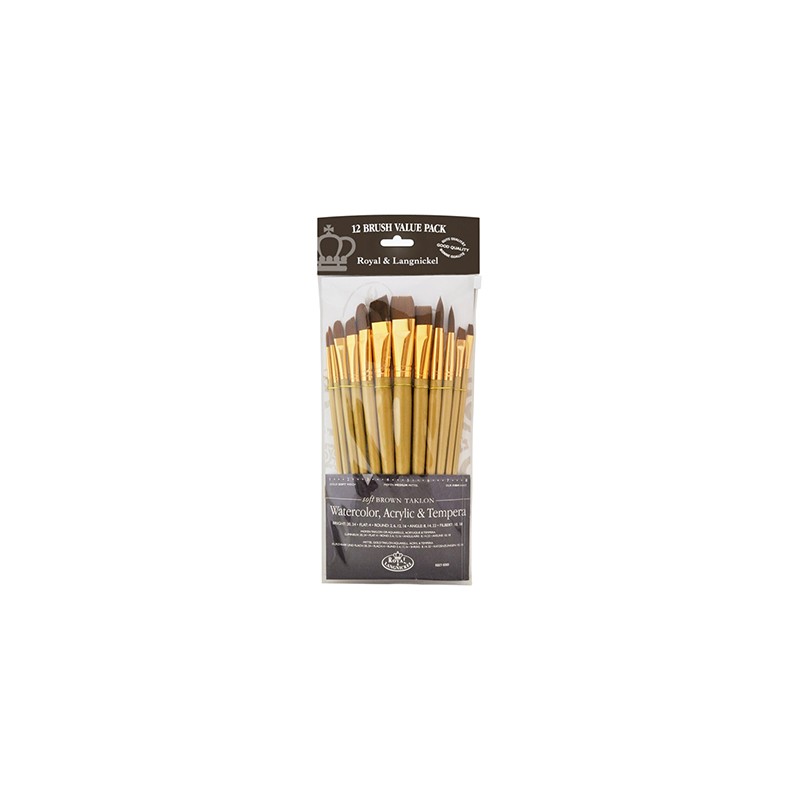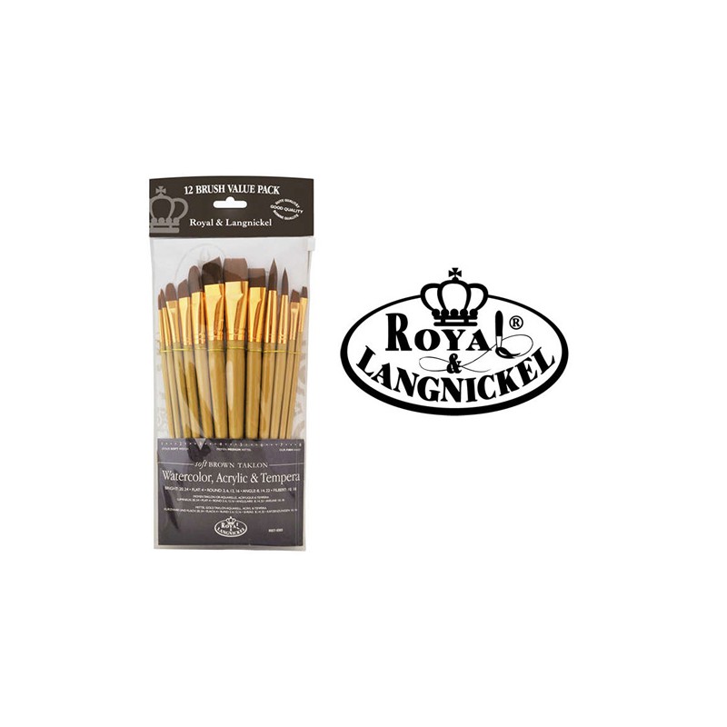 Mieszany zestaw długich (23-25cm), syntetycznych pędzli z miękkiego włosia w kolorze brązowym. Drewniana rączka, metalowa skuwka. Produkt firmy Royal & Langnickel. Komplet 12-stu różnorodnych pędzli przeznaczonych do farb akrylowych i temper. Foliowe opakowanie zawiera: