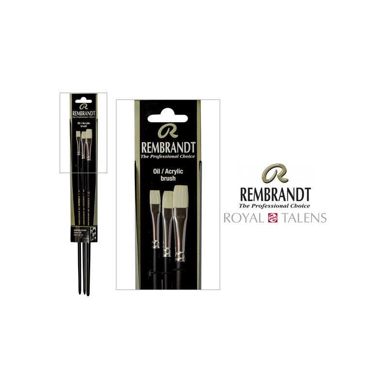 Komplet pędzli do farb olejnych i akrylowych. Wykonane z syntetycznej szczeciny. Produkt serii Rembrandt marki Royal-Talens. Komplet trzech pędzli płaskich: seria 237 nr: 4, 8 i 12. Trzonki o długości 25,5cm.