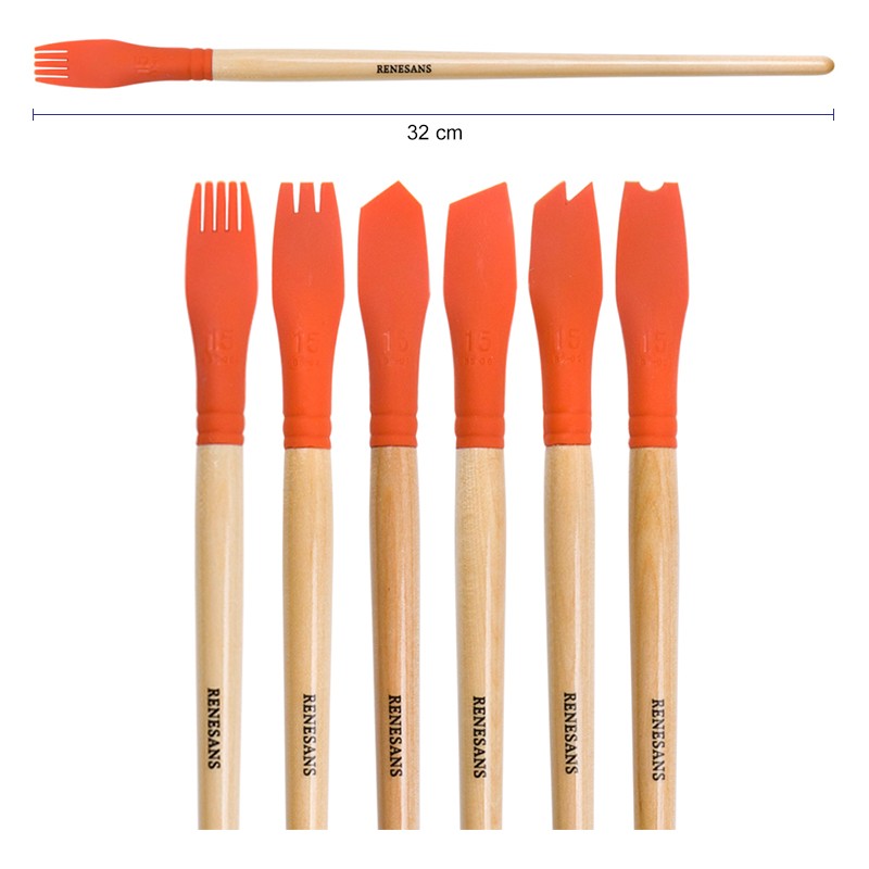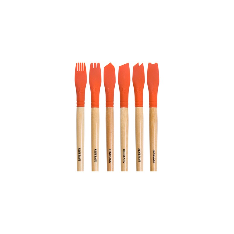 Zestaw 6 pędzli z miękkiego silikonu marki Renesans. 6 różnych kształtów pomarańczowego silikonu, osadzonego na długiej, drewnianej rączce. Więcej szczegółów