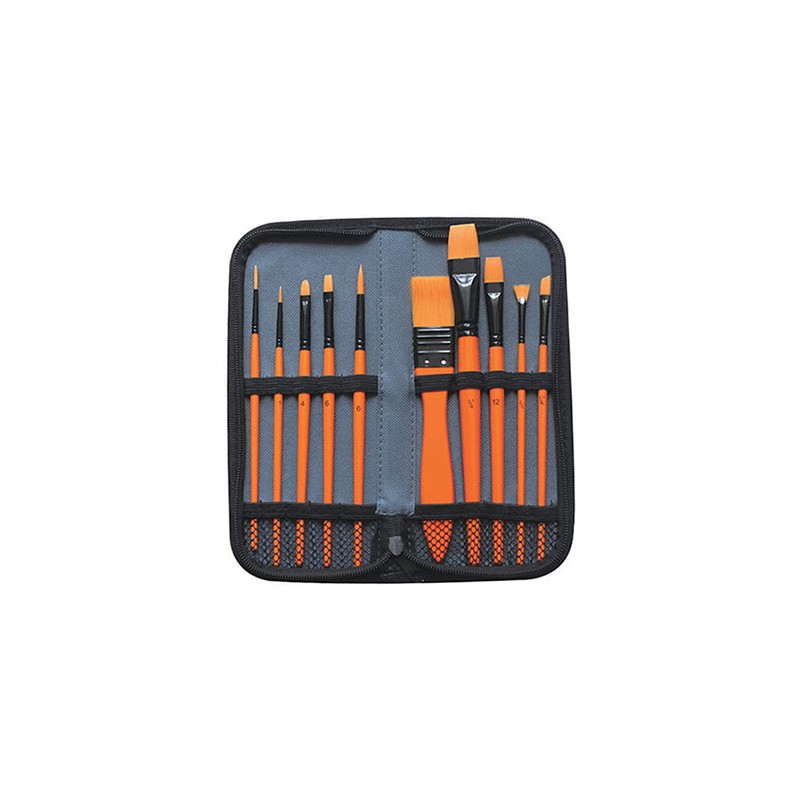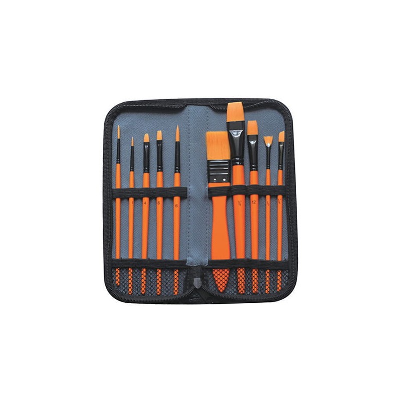 Pędzle syntetyczne o różnych kształtach, przeznaczone do malowania farbami akrylowymi, temperami i gwaszami. 10 pędzli umieszczono w wygodnym, zamykanym na suwak etui. Pędzle posiadają drewniane, lakierowane na pomarańczowo trzonki. W etui znajduje się elastyczna taśma przytrzymująca każdy pędzel z osobna. Zestaw pędzli syntetycznych w etui to przydatne akcesorium dla osób malujących na przykład w plenerze. Uniwersalny zestaw pozwala na komfortową pracę zarówno przy malowaniu większych powierzchni jak i pracę z najmniejszymi detalami.