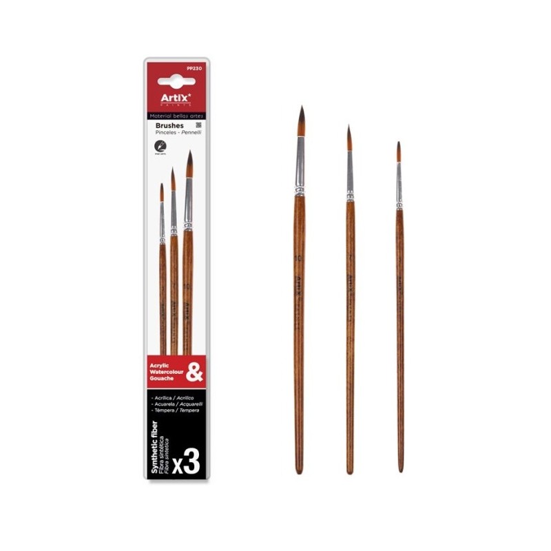 Zestaw pędzli syntetycznych Artix do farb akrylowych, akwarelowych i temper. 3 pędzle o okrągłym kształcie nr 10, 7 i 3. Więcej szczegółów