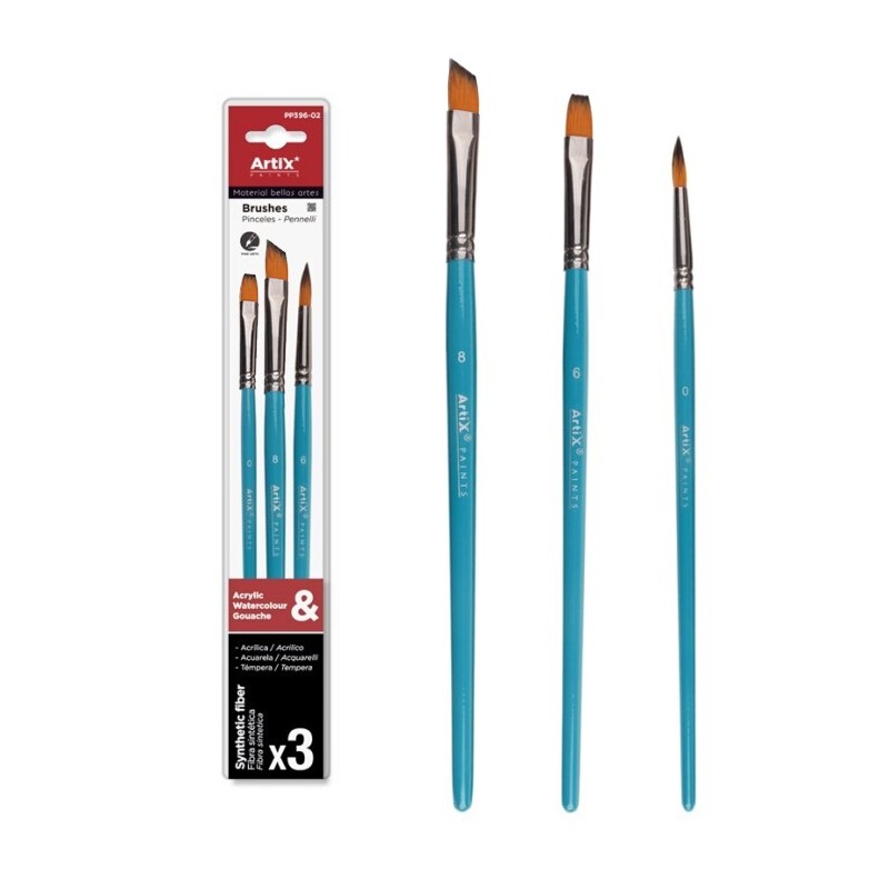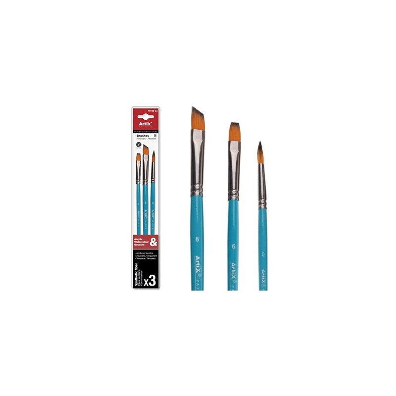 Zestaw pędzli syntetycznych Artix do farb akrylowych, akwarelowych i temper. 3 pędzle: okrągły, płaski i ukośnie ścięty. Więcej szczegółów