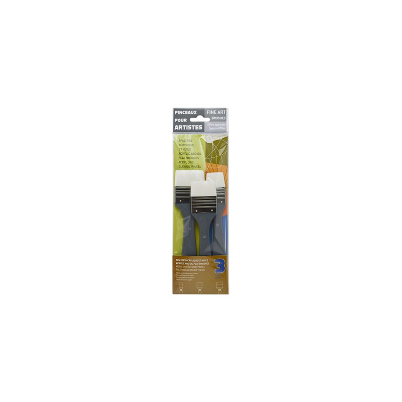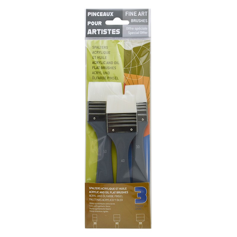 Szerokie pędzle płaskie wykonane z włosia syntetycznego, szczególnie polecane do werniksowania i malowania dużych powierzchni. Włosie miękkie i sprężyste - nieco krótsze niż w przypadku syntetycznych pędzli z włosiem pomarańczowym tej samej marki. W skład zestawu wchodzą 3 pędzle, numery: 30, 40 i 50. Rączka wykonana z lakierowanego na szaro drewna.