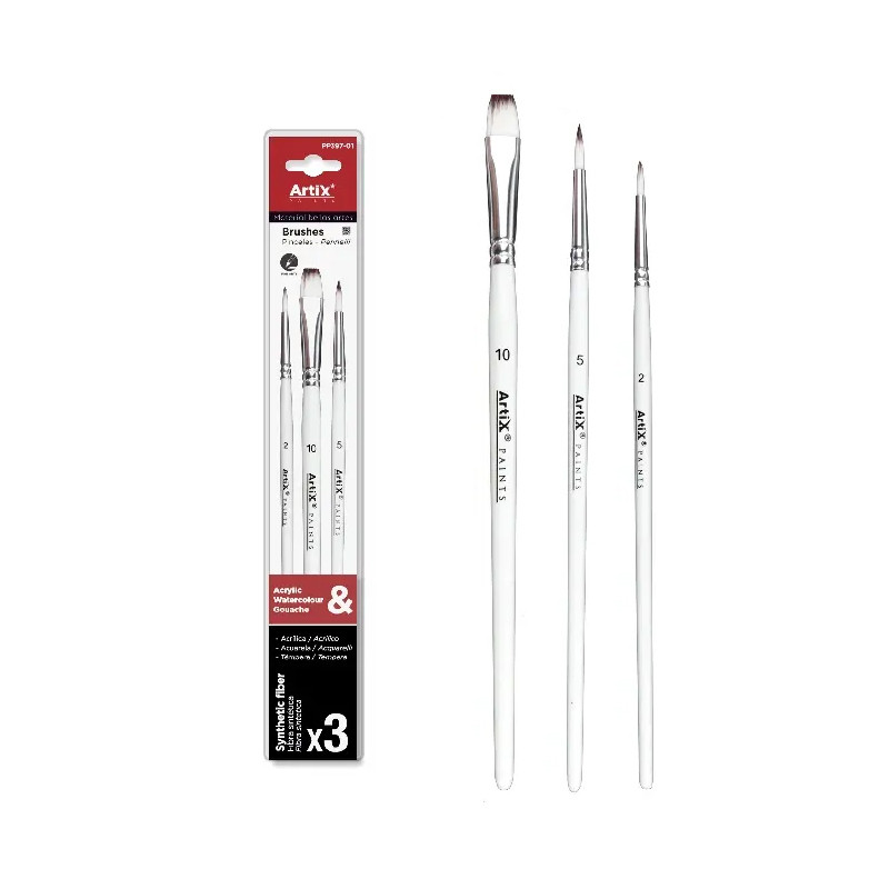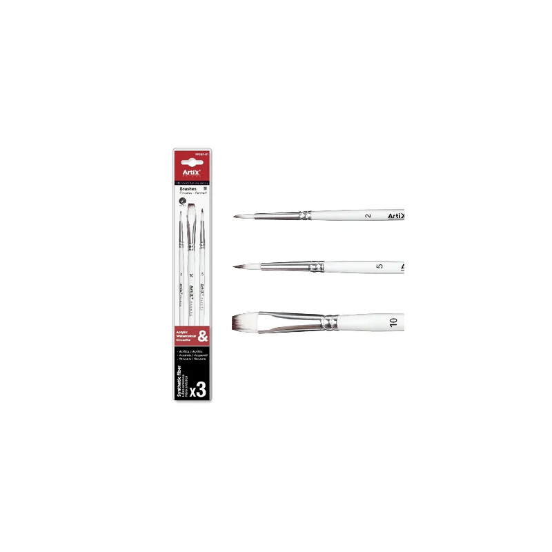 Zestaw pędzli syntetycznych Artix, do farb akrylowych, akwarelowych i temper. 2 okrągłe pędzle nr 0 i 5 oraz płaski pędzel nr 10. Więcej szczegółów