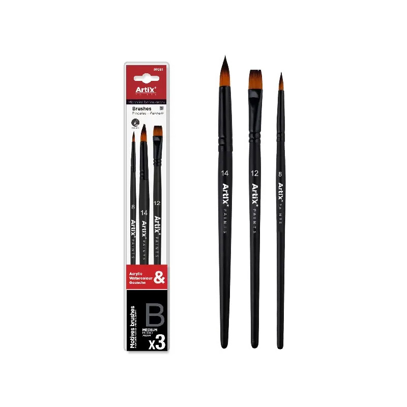 Zestaw pędzli syntetycznych Artix, do farb akrylowych, akwarelowych i temper. Komplet zawiera pędzel płaski i dwa pędzle okrągłe. Więcej szczegółów