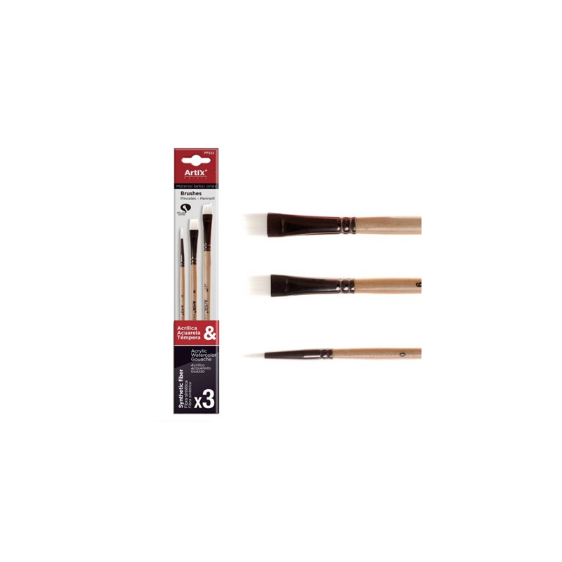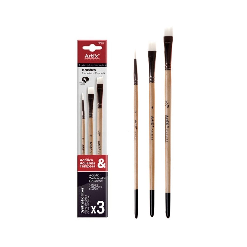 Zestaw pędzli syntetycznych Artix do farb akwarelowych, akrylowych i temper. Komplet zawiera pędzel płaski, ukośnie ścięty i okrągły. Więcej szczegółów