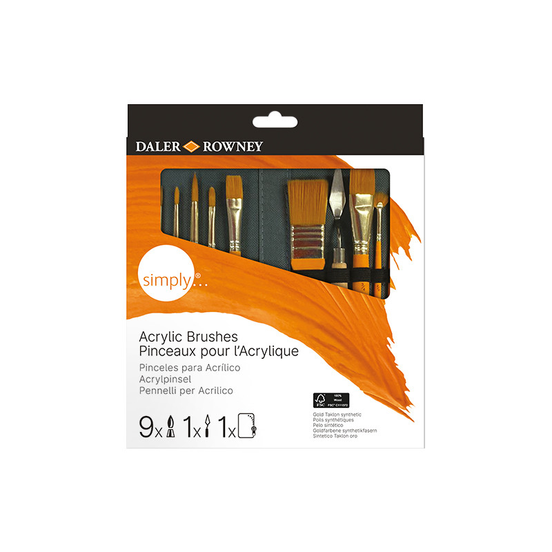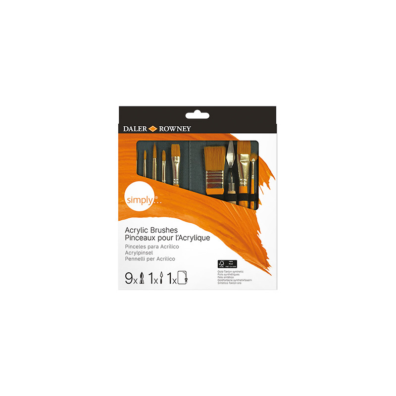 Zestaw pędzli serii Simply angielskiej formy Daler Rowney, przeznaczonych do farb akrylowych. W zestawie szpachelka malarska i zamykane etui na pędzle. Więcej szczegółów
