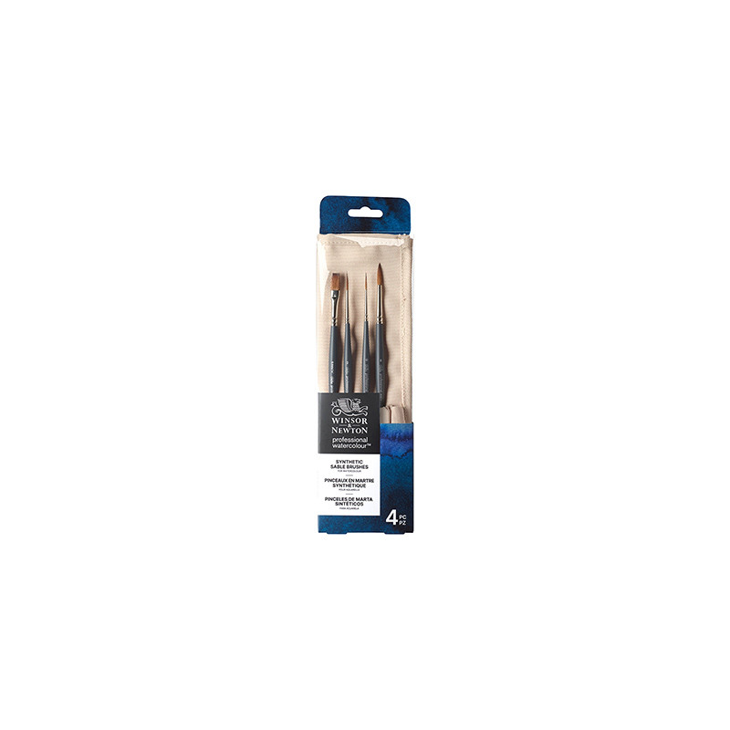Komplet 4 syntetycznych pędzli serii Professional Watercolour marki Winsor & Newton, przeznaczonych do farb akwarelowych i wodnych + płócienne etui. Więcej szczegółów