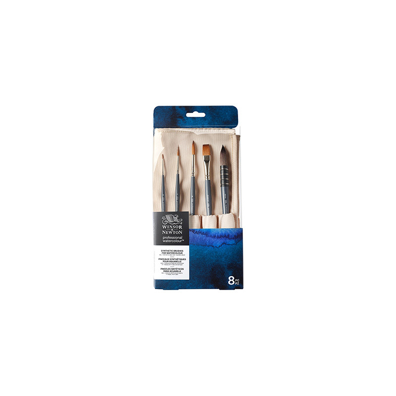 Komplet 8 syntetycznych pędzli serii Professional Watercolour marki Winsor & Newton, przeznaczonych do farb akwarelowych i wodnych + płócienne etui. Więcej szczegółów