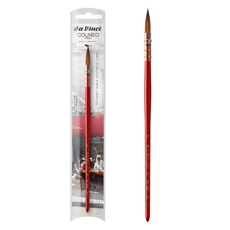 Pędzel serii Colineo Red marki da Vinci. Syntetyczne włókna imitujące włosie sobola Kolinsky. Krótki lakierowany trzonek w kolorze czerwonym. Więcej szczegółów