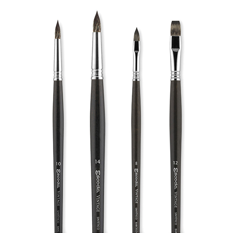 Zestaw artystycznych pędzli malarskich Vintage marki Escoda. 4 sztuki pędzli z syntetycznym włosiem, długie lakierowane trzonki. Do farb akrylowych i olejnych. Więcej szczegółów