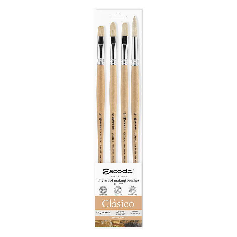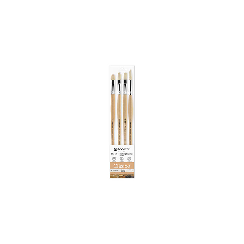 Zestaw artystycznych pędzli malarskich Clasico marki Escoda. 4 sztuki pędzli z naturalnym włosiem, długie lakierowane trzonki. Do farb olejnych i akrylowych. Więcej szczegółów