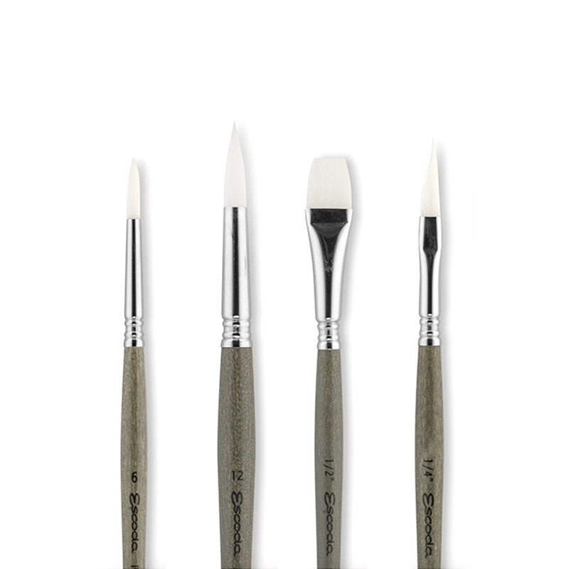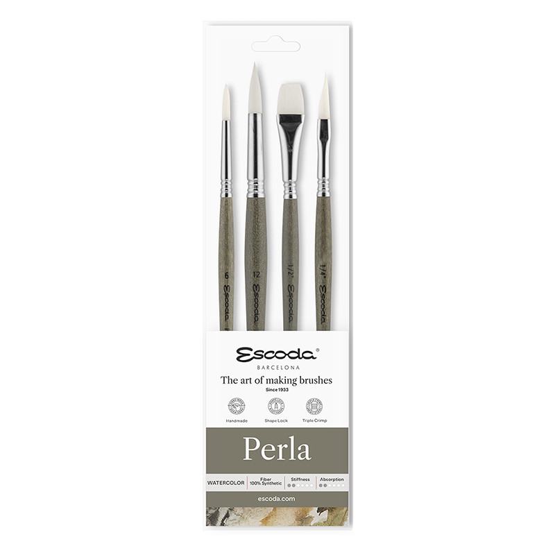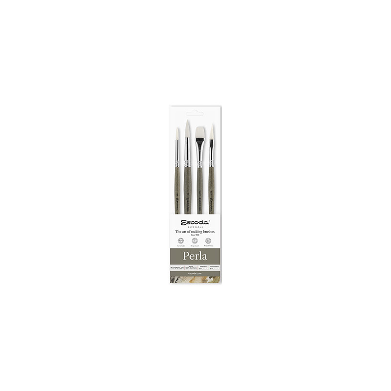Zestaw artystycznych pędzli malarskich Perla marki Escoda. 4 sztuki pędzli z syntetycznym włosiem, krótkie lakierowane trzonki. Do farb akwarelowych. Więcej szczegółów