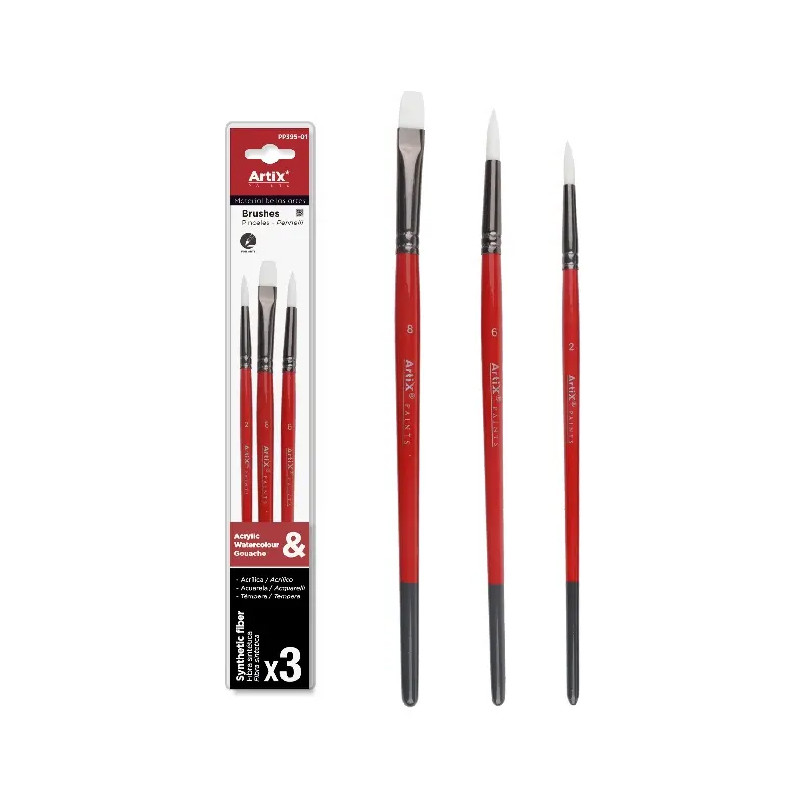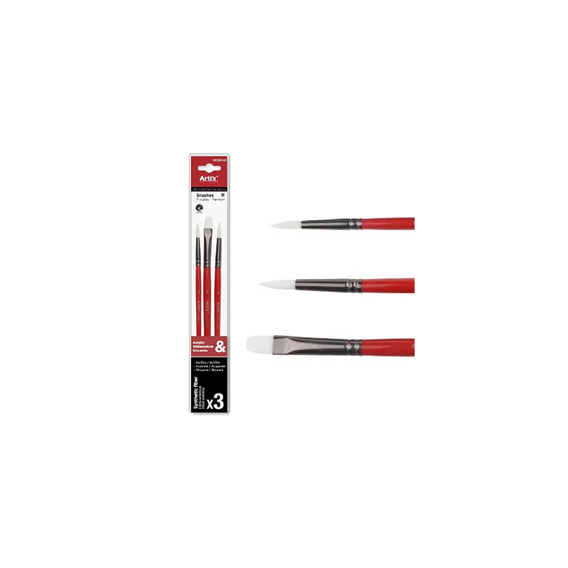 Zestaw pędzli syntetycznych Artix, do farb akrylowych, akwarelowych i temper. Komplet zawiera dwa pędzle okrągłe i jeden płaski. Więcej szczegółów