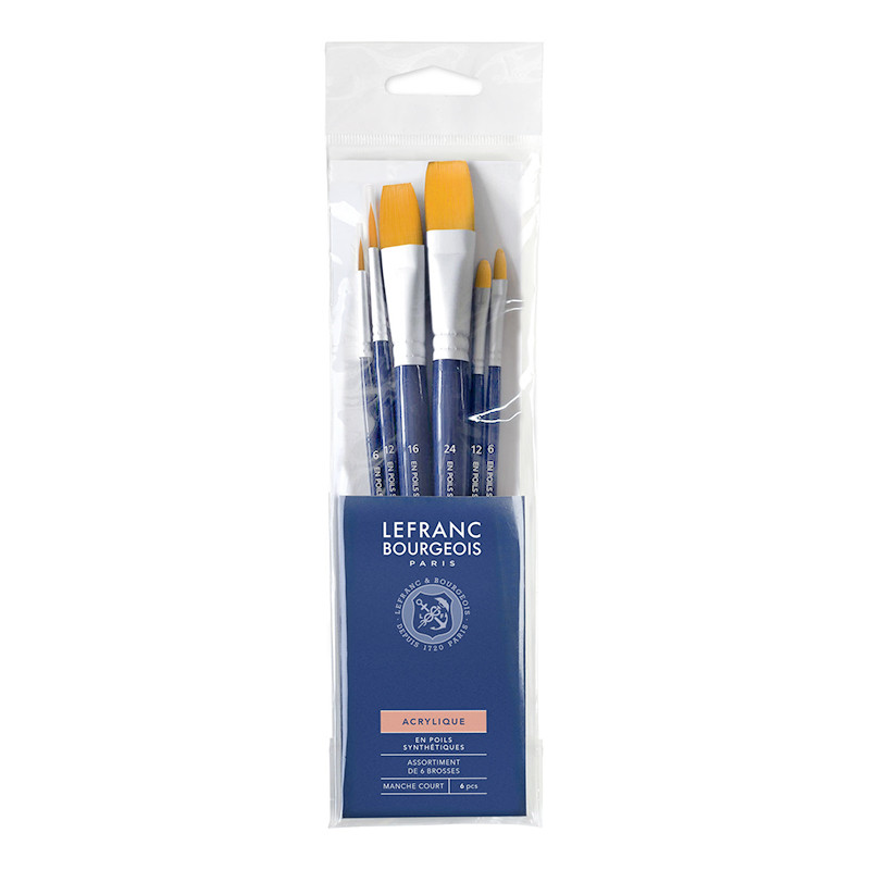 Zestaw pędzli syntetycznych marki Lefranc & Bourgeois, uniwersalne pomarańczowe włosie do każdego rodzaju farb. Zestaw 6 sztuk o różnych kształtach. Więcej szczegółów
