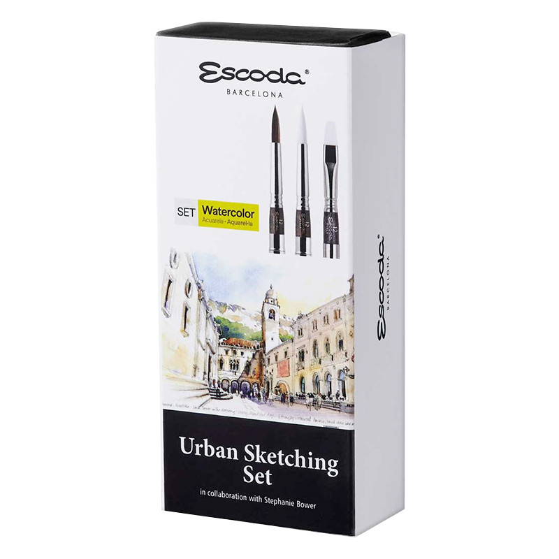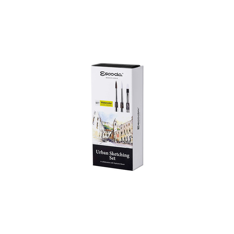 Urban Sketching Set Escoda – komplet syntetycznych, składanych pędzli serii Perla. 3 pędzle w etui z tworzywa.