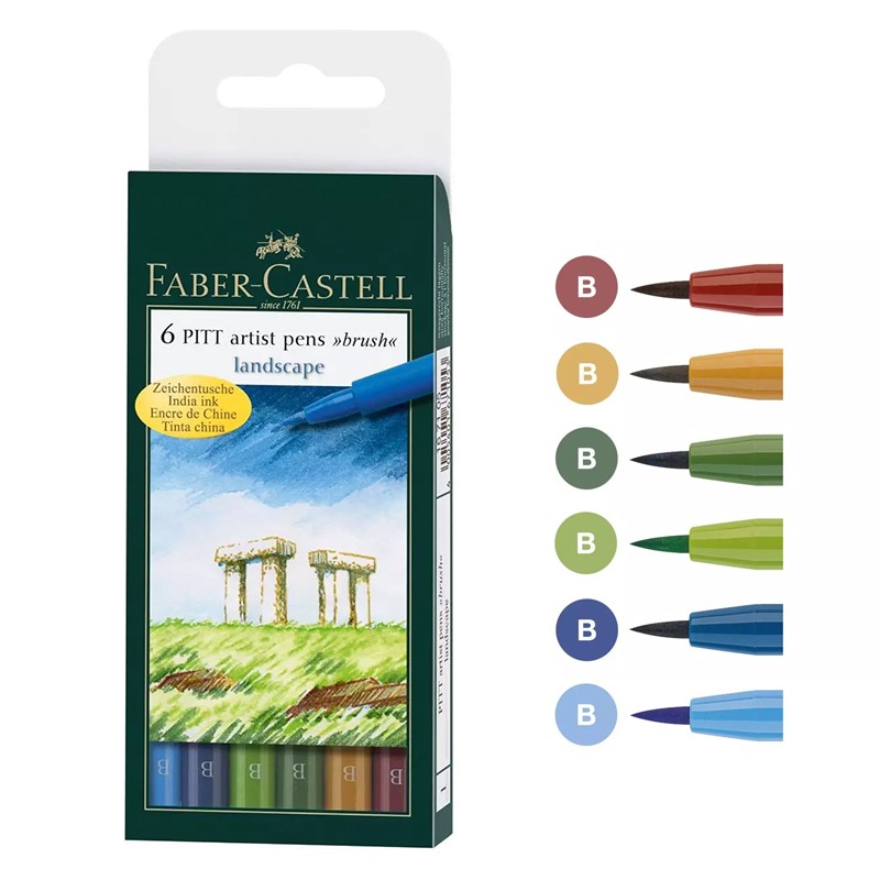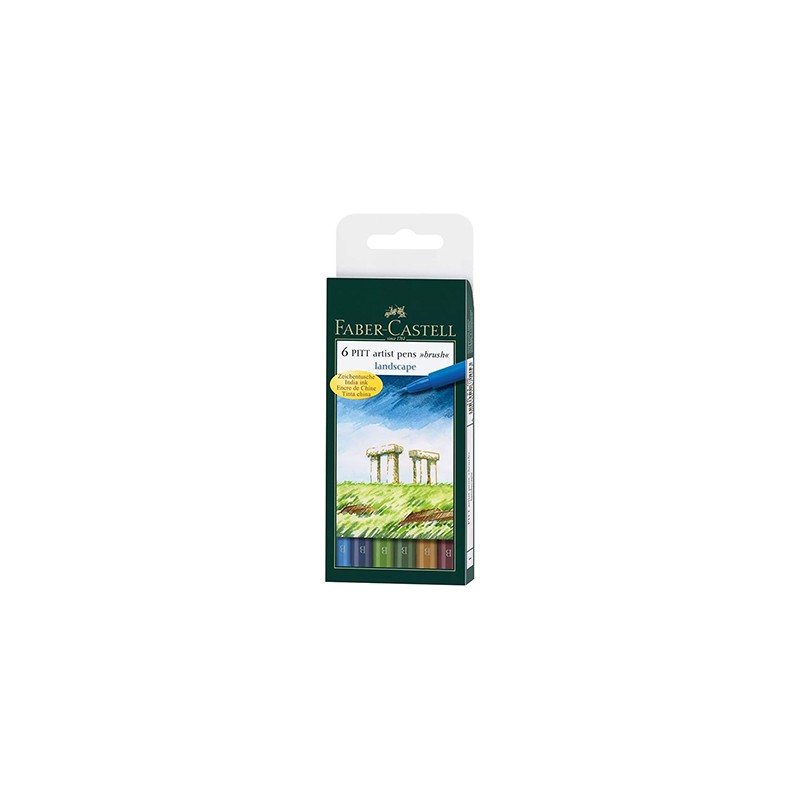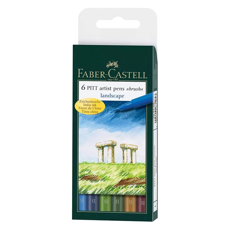 Pitt artist pen Faber Castell. Zestaw 6 pisaków wyselekcjonowanych pod kontem pejzażu. W skład zestawu wchodzą kolory: smalt blue, indianthrene blue, may green, chrome green opaque, green gold, indian red. Pisaki z końcówką pędzelkową (brush pen).