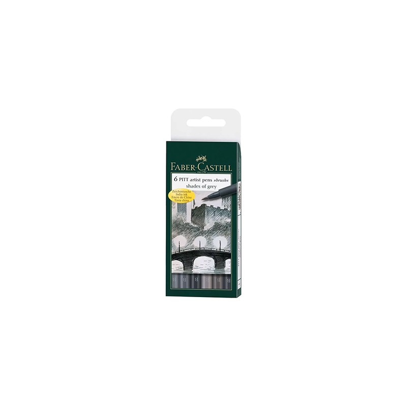 Pitt artist pen Faber Castell. Zestaw 6 pisaków w odcieniach szarości. W skład zestawu wchodzą kolory: cold gray III, cold gray IV, cold gray V, warm gray III, warm gray IV, warm gray V. Pisaki z końcówką pędzelkową (brush pen).