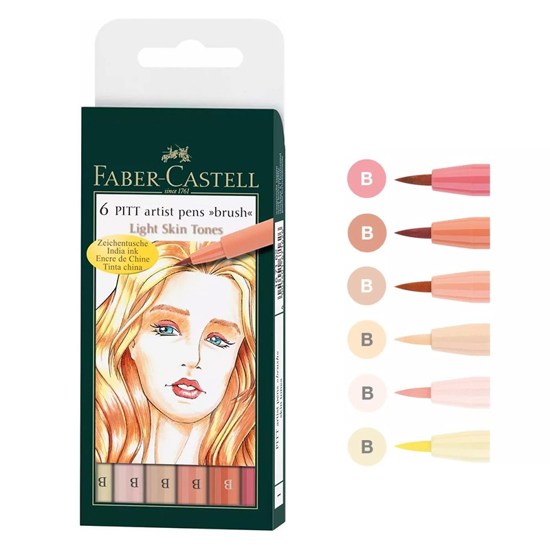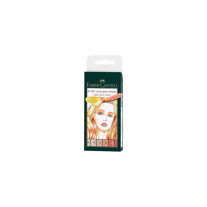 Pitt artist pen Faber Castell. Zestaw 6 pisaków w kolorach cielistych. W skład zestawu wchodzą kolory: ivory, light skin, medium skin, light flesh, cinnamon, medium flesh. Pisaki z końcówką pędzelkową (brush pen).