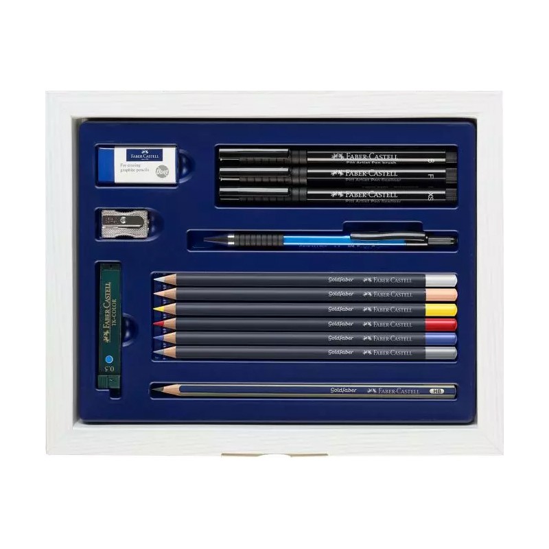 Komplet do tworzenia ilustracji i komiksów zawiera wszystkie niezbędne akcesoria do rozpoczęcia pracy w tej technice - ołówki do stworzenia szkicu, pisaki Pitt Artist Pen do rysowania konturów, kredki serii Goldfaber do kolorowych wypełnień. Niebieskie wkłady do ołówków są idealne, jeśli chcesz zdigitalizować swój rysunek, ponieważ ich oznaczenia znikają podczas skanowania rysunku w trybie czarno-białym. Zestaw zawiera także bezpyłową gumkę do mazania oraz temperówkę. Obszerna książeczka instruktażowa pomoże w kreowaniu postaci i ich pozycji.
