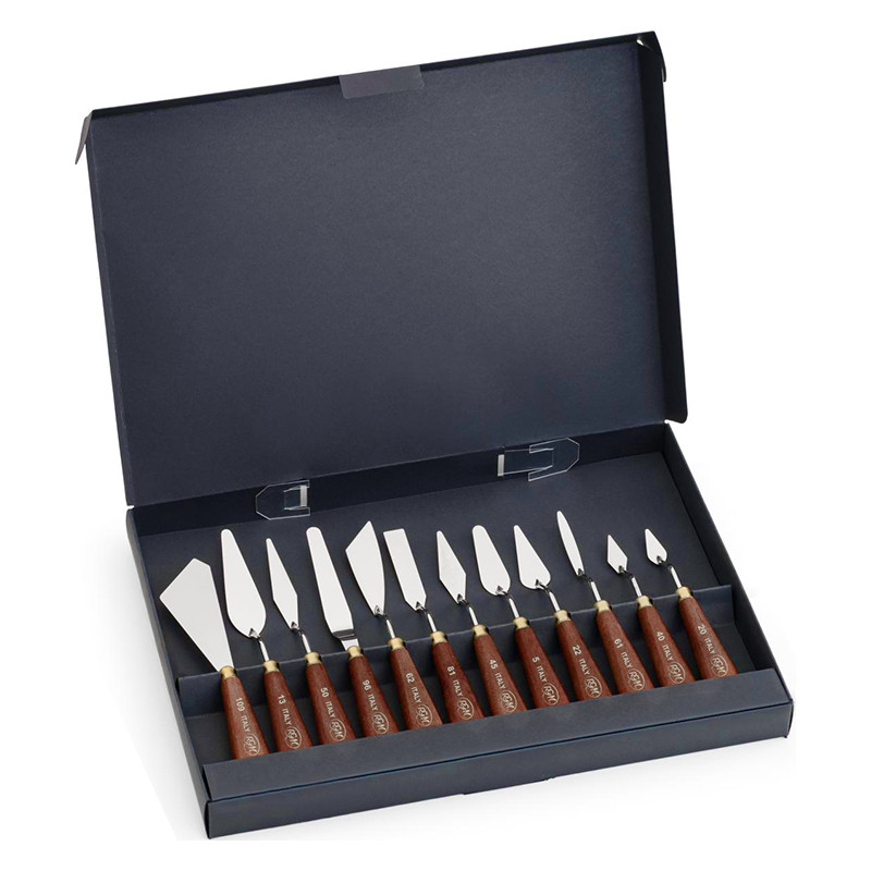 Profesjonalne szpachelki i noże malarskie wykonane z wysokiej jakości stali i drewna. Zestaw zawiera 12 szpachelek o różnych kształtach, rozmiarach i profilach - ten szeroki wachlarz pozwala dostosować odpowiednio szpachelkę do zamierzonej pracy. Szpachelki malarskie znajdują zastosowanie podczas pracy z farbami olejnymi, akrylowymi oraz pastami strukturalnymi. Idealne do tworzenia w technice impasto - nakładania grubych warstw farby. Prace malarskie powstałe przy użyciu noży i szpachli posiadają niepowtarzalny, często dynamiczny charakter.
