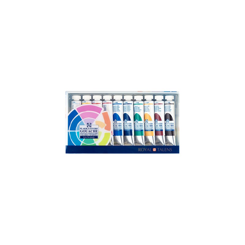 Zestaw wysokiej jakości gwaszy, holenderskiej marki Royal-Talens. Plastikowe opakowanie zawiera 10 tubek farby o pojemności 20 ml.
