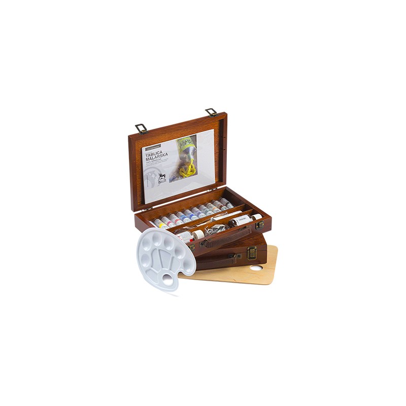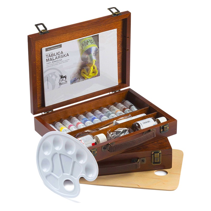 Gwasze marki Renesans, komplet 12 kolorów w drewnianej kasecie + paleta do mieszania kolorów, podobrazie płytowe, media oraz pędzel. Więcej szczegółów