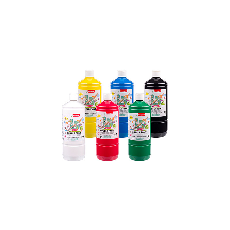 Poster Paint Bruynzeel – komplet farb plakatowych, 6 farb w podstawowej gamie kolorystycznej, butelki o pojemności 1000 ml.