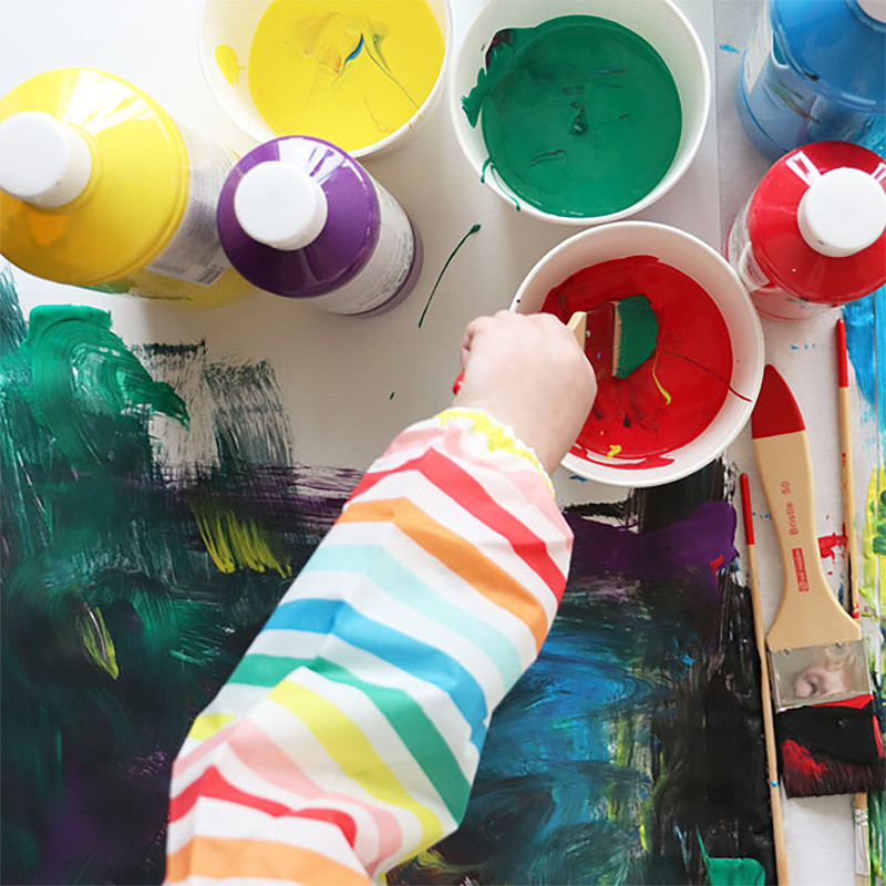 Zestaw farb Poster Paint marki Bruynzeel. 6 podstawowych kolorów w butelkach o pojemności 1000 ml. Polecane na zajęcia plastyczne z dziećmi. Więcej szczegółów