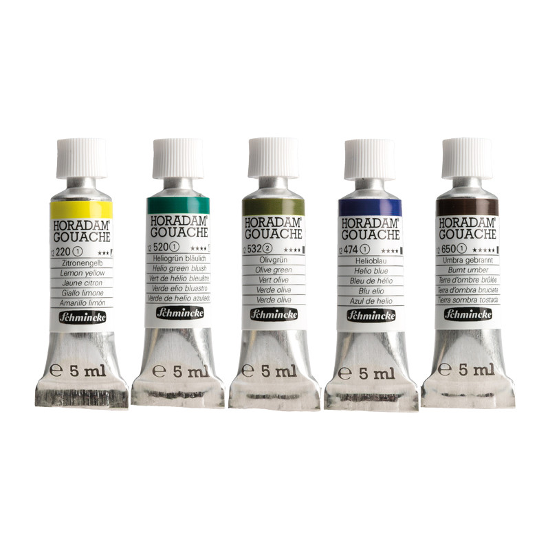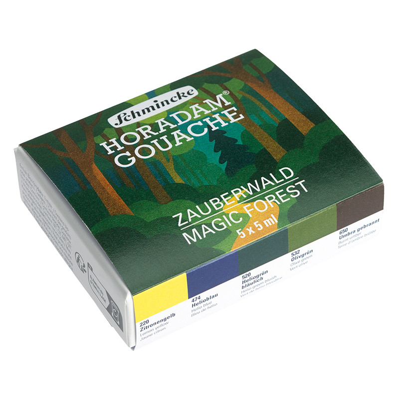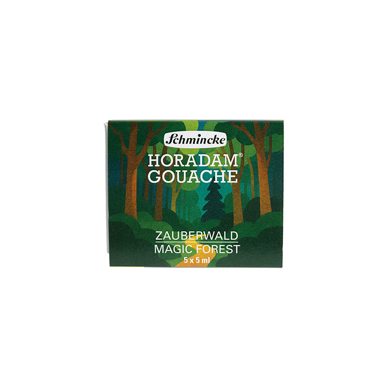 Magic Forest Set. Komplet farb Gouache Horadam marki Schmincke 5 tubek o pojemności 5 ml. Tekturowe opakowanie. Edycja limitowana. Więcej szczegółów